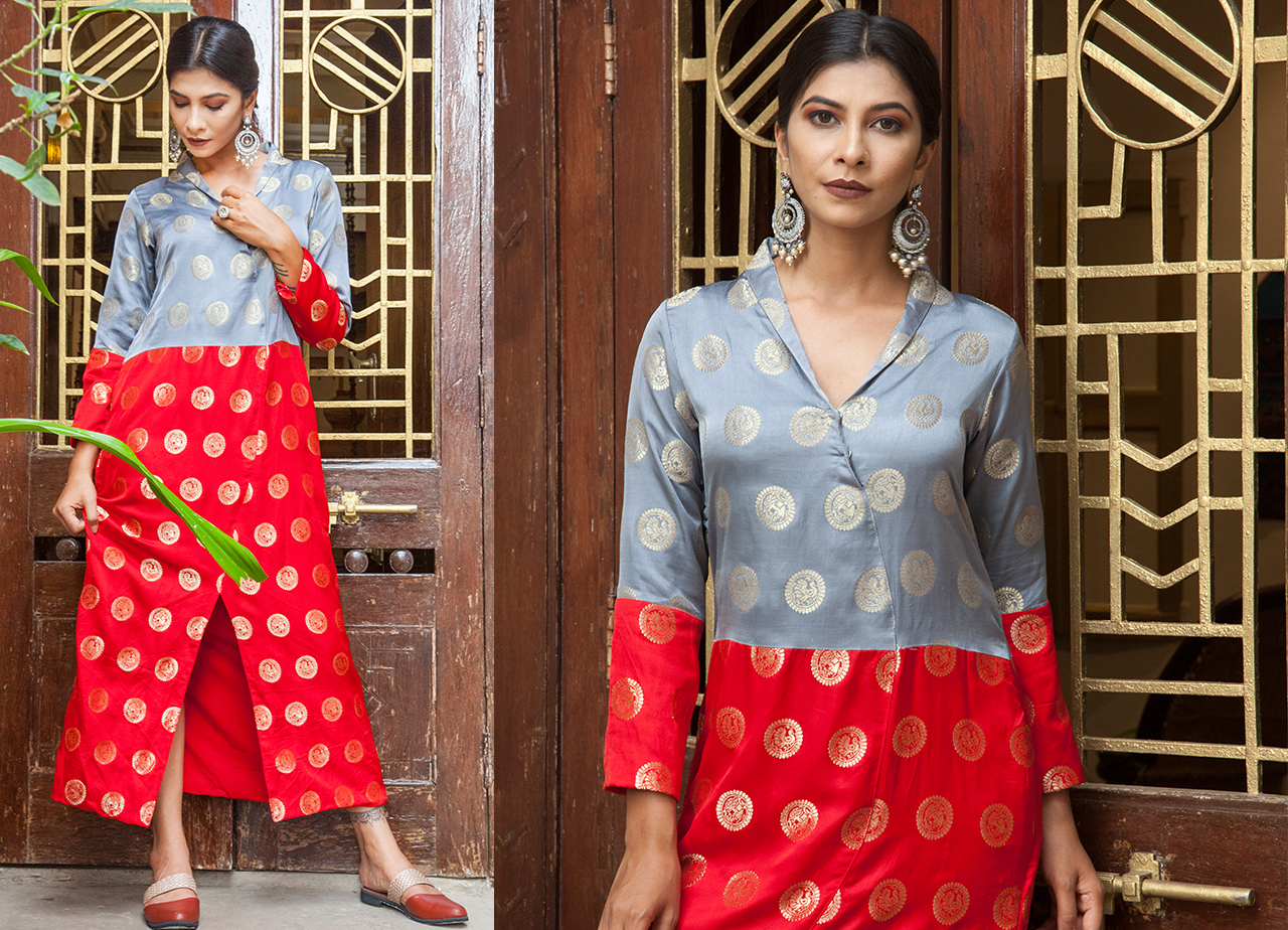 The collection explores fabrics, colours and surface techniques. The styles and silhouettes vary from dressy casuals to semi-formal festive wear. The amalgamation of the silhouettes and the surface techniques is a representation of ‘Contemporary Ethnic’ garments, perfect for the Indian Female body types. All the garments are very easy to carry and can be worn on multiple occasions. The Handloom Silk and Cotton along with the Hand Embroideries remain the highlight of this collection.